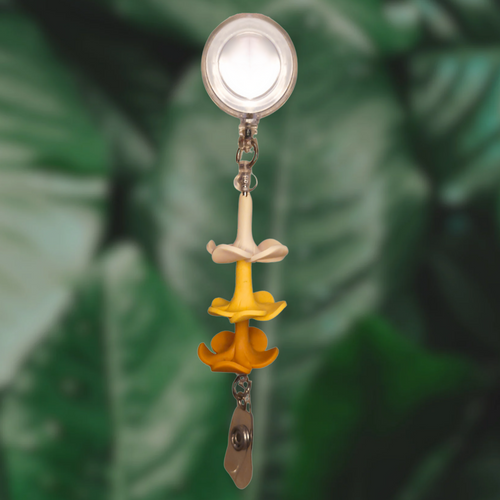 Badge reel with handmade clay puakenikeni
